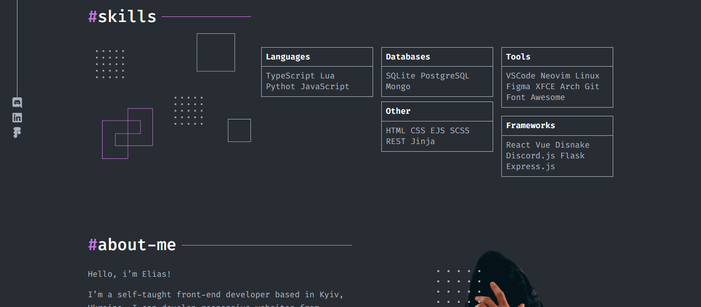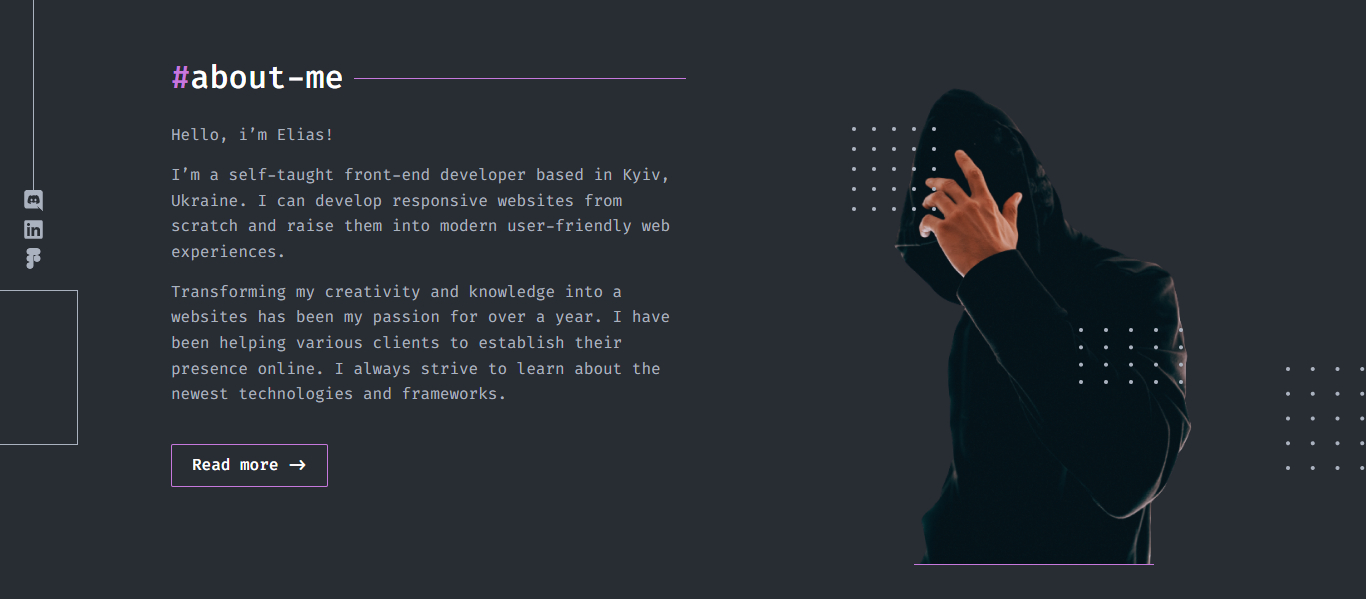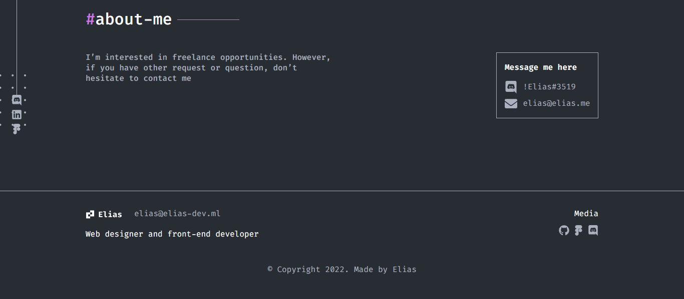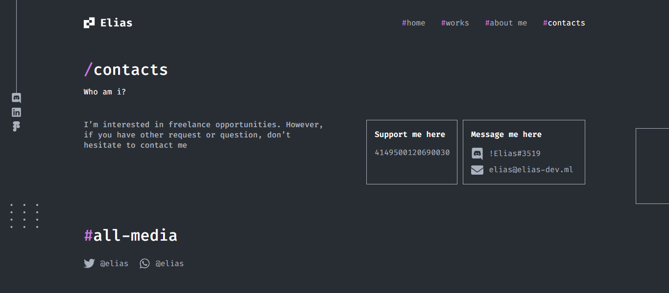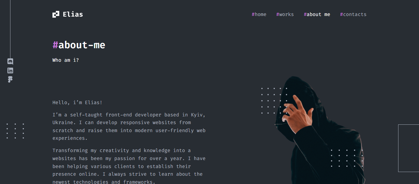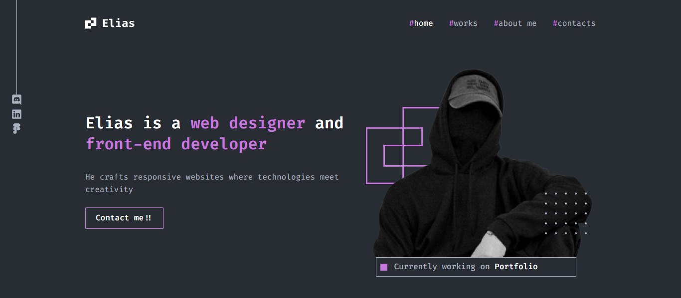 Создан сайт для веб-дизайнера Elias на WordPress с помощью Elementor. Включает главную страницу с портфолио и информацией об услугах, а также две дополнительные страницы: “Обо мне” и “Контакты” для связи с клиентами.